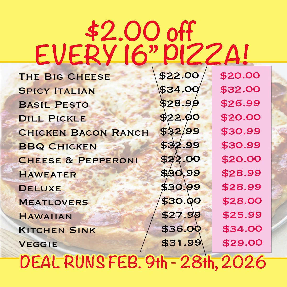 PIZZA SPECIAL : From Monday, February 9th thru to Saturday, February 28th we are offering $2.00 EVERY 16” PIZZA!