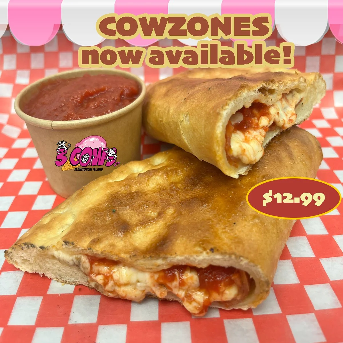 NEW! PIZZA PIES ARE HERE! : Try our NEW COWZONES - if you like 3 Cows Signature Pizza crust, tasty pepperoni’s, oooey-gooey mozzarella cheese & a delish tomato sauce, you’re bound to enjoy our NEW COWZONES! Easy to eat, and perfect for those who have to eat on the run, or anyone able to sit & enjoy the perfect pie! Pick one up today for only $12.99.