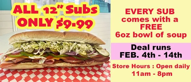 From February 4 to February 14, get ANY 12” sub for ONLY $9.99, and we’ll add in a FREE cup of our daily soup with each purchase.